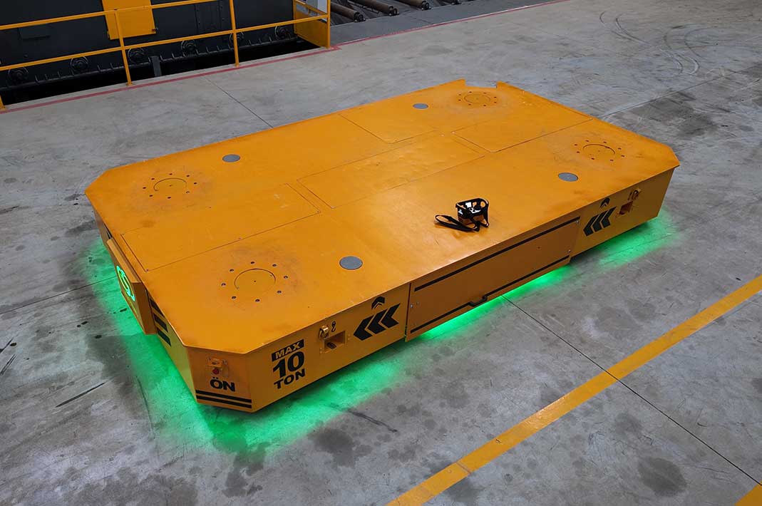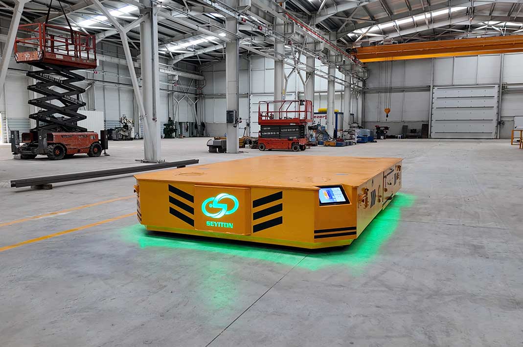 Dört teker dümenleme sistemi, yengeç hareketi ve 360° dönüş gibi gelişmiş manevra özellikleri ile dar alanlarda dahi yüksek hareket kabiliyeti sağlıyor. 40 m/dk hızla yük taşıyabilen bu transfer arabası, ağır yüklerin hızlı, güvenli ve hassas şekilde taşınması için ideal bir çözüm sunuyor.